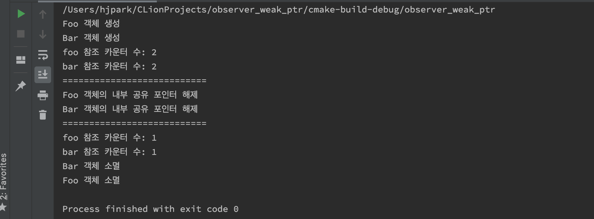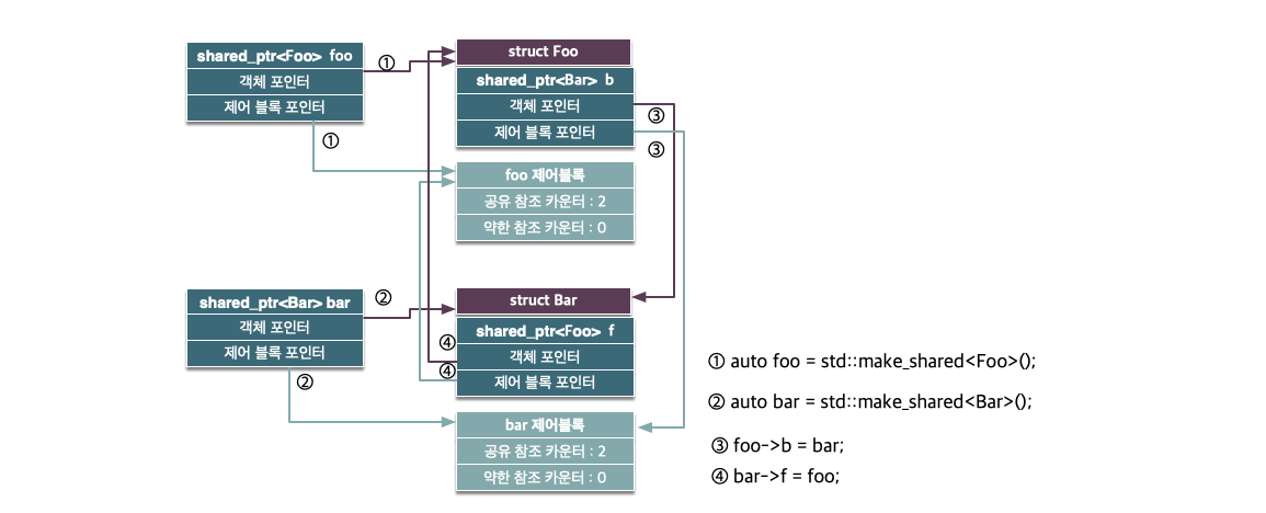 int main() { { auto foo = std::make_shared<Foo>(); auto bar =std::make_shared<Bar>(); foo->b = bar; bar->f = foo; std::cout << "foo 참조 카운터 수: " << foo.use_count() << std::endl; std::cout << "bar 참조 카운터 수: " << bar.use_count() << std::endl; std::cout << "===========================\n"; std::cout << "Foo 객체의 내부 공유 포인터 해제" << std::endl; foo->b = nullptr; std::cout << "Bar 객체의 내부 공유 포인터 해제" << std::endl; bar->f = nullptr; std::cout << "===========================\n"; std::cout << "foo 참조 카운터 수: " << foo.use_count() << std::endl; std::cout << "bar 참조 카운터 수: " << bar.use_count() << std::endl; } return 0;