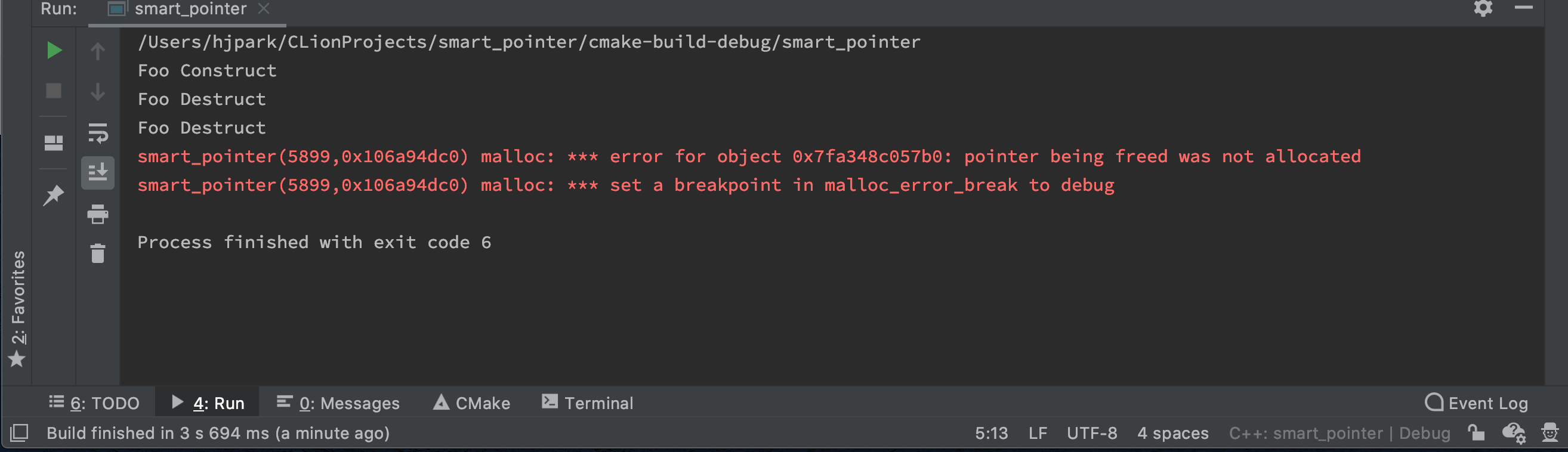 int main() { auto ptr_foo = new Foo(); auto p0 = std::shared_ptr<Foo>(ptr_foo); //ptr_foo를 가리키는 공유 포인터 생성 auto p1 = std::shared_ptr<Foo>(ptr_foo); //동일한 ptr_foo를 가리키는 공유 포인터를 또 다시 생성 //프로세스 종료 시 두 번의 소멸자가 호출되어 예외 발생 return 0; }