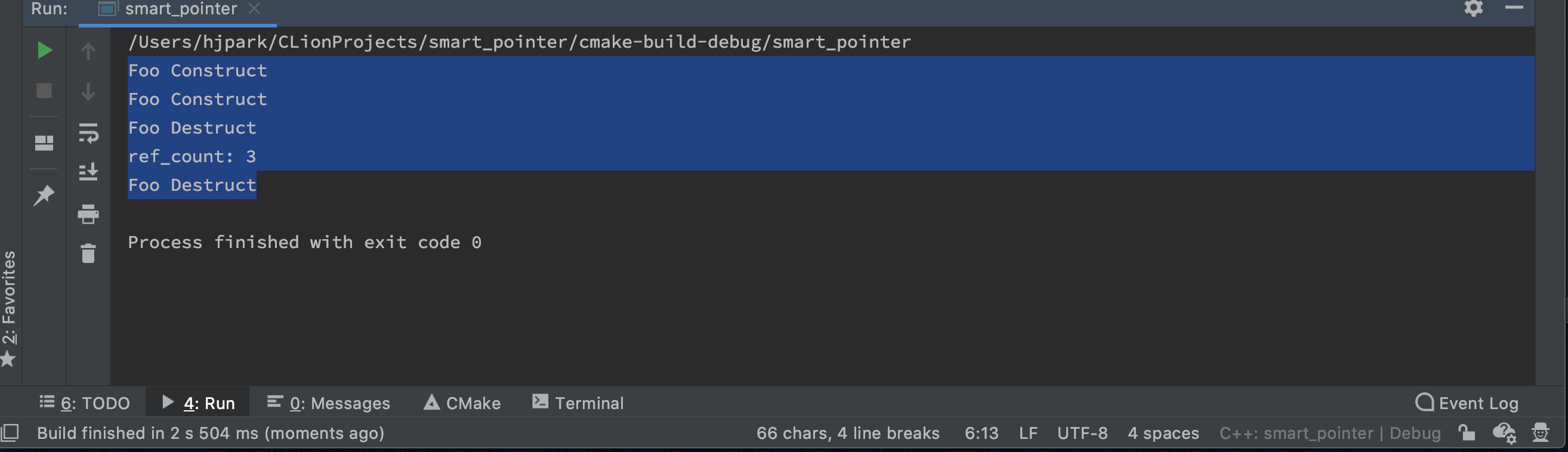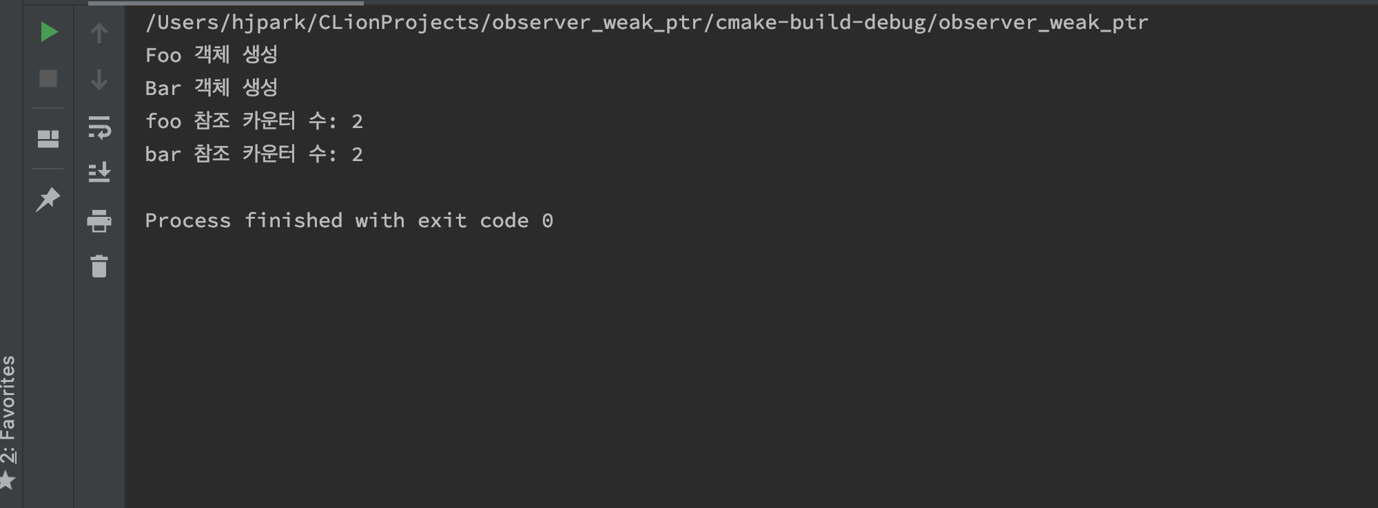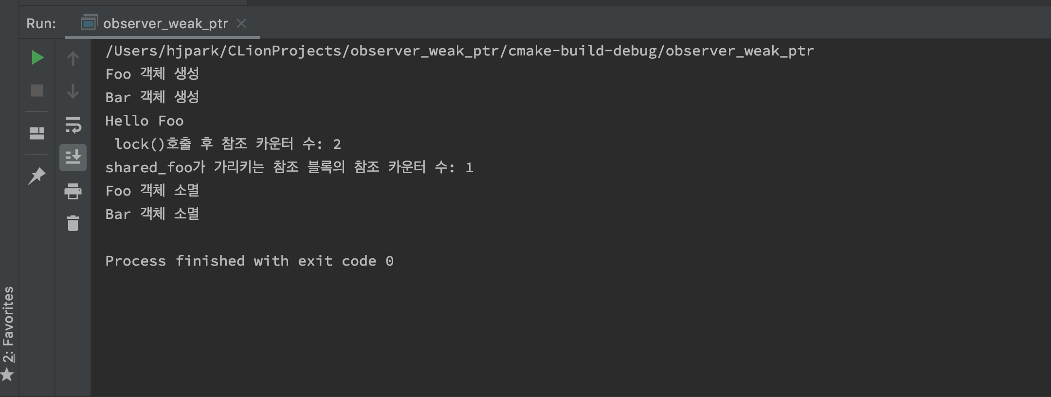 struct Foo { public: Foo() { std::cout << "Foo Construct\n"; } ~Foo() { std::cout << "Foo Destruct\n"; } }; int main() { auto p0 = std::shared_ptr<Foo>(new Foo); //referece_count = 1; auto p1 = p0; //referece_count = 2; auto p2 = std::make_shared<Foo>(); //referece_count = 1; p2 = p1; //복사 할당 연산 //p2가 가리키던 refrece_count = 0 으로 객체 소멸, p0, p1, p2가 가리키는 referece_count = 3; std::cout << "ref_count: " << p0.use_count() << std::endl; return 0; }