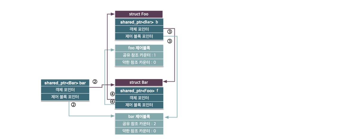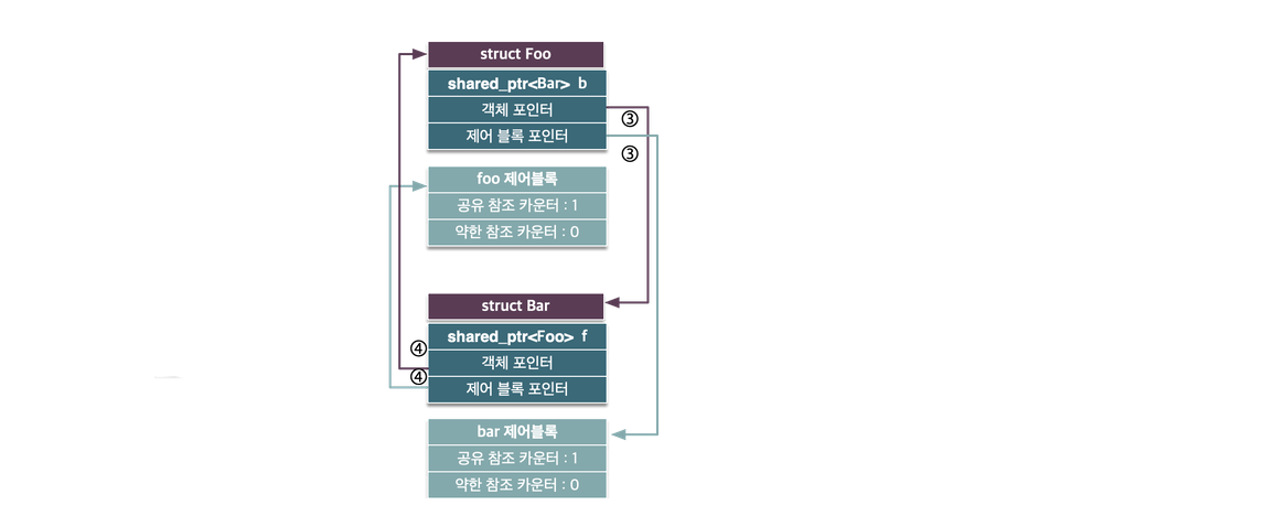 두 공유 포인터가 소멸되었지만 공유 포인터 foo와 bar가 가리키던 객체 내부의 공유 포인터들이 서로를 가리키고 있으므로 공유 참조 카운트는 0이 되지 못한다. 이는 foo와 bar 공유 포인터가 범위를 벗어나기 전 해당 멤버 변수 foo->b 나 bar->f를 해제해 주면 정상적으로 메모리를 해제할 수 있다.