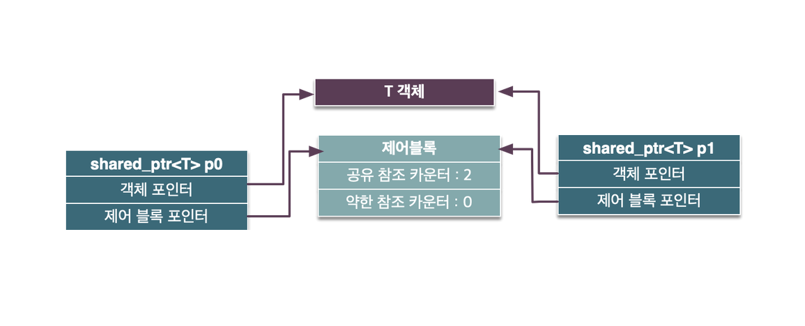 이렇게 메모리가 해제되는 시점은 원자적 참조 횟수(atomic reference count)를 통해 공유 포인터 생성 시 카운트를 증가시키고, 소멸 시 카운트를 감소시킨다. 복사 배정 연산자의 경우 증가와 감소가 모두 일어난다. 참조 횟수는 제어 블록(control block)에서 관리하며 공유 포인터의 대략적인 구조는 아래와 같다.
