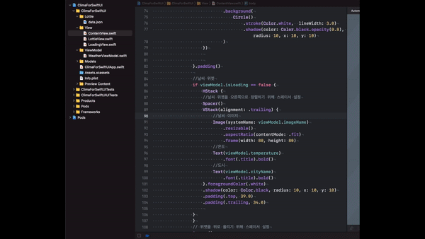 struct ContentView: View { ... var body: some View { ZStack { ... } VStack { //SearchBar 영역 WeatherSearchBar(viewModel: viewModel) //날씨 위젯 if viewModel.isLoading == false { WeatherWidget(viewModel: viewModel) } // 위젯을 위로 올리기 위해 스페이서 설정 Spacer() } } } } struct WeatherWidget: View { @ObservedObject var viewModel : WeatherViewModel var body: some View { ... } } struct WeatherSearchBar: View { @ObservedObject var viewModel : WeatherViewModel @State private var searchTerm = "" var body: some View { ... } }LocationService 클래스