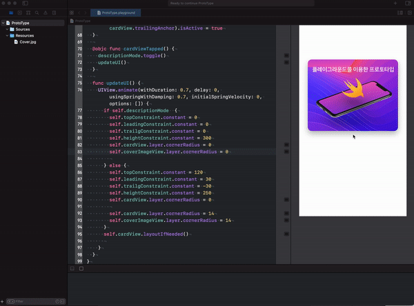 @objc func cardViewTapped() { descriptionMode.toggle() updateUI() } func updateUI() { UIView.animate(withDuration: 0.7, delay: 0, usingSpringWithDamping: 0.7, initialSpringVelocity: 0, options: []) { if self.descriptionMode { self.topConstraint.constant = 0 self.leadingConstraint.constant = 0 self.trailgConstraint.constant = 0 self.heightConstraint.constant = 300 self.cardView.layer.cornerRadius = 0 self.coverImageView.layer.cornerRadius = 0 } else { self.topConstraint.constant = 120 self.leadingConstraint.constant = 30 self.trailgConstraint.constant = -30 self.heightConstraint.constant = 250 self.cardView.layer.cornerRadius = 0 self.cardView.layer.cornerRadius = 14 self.coverImageView.layer.cornerRadius = 14 } self.cardView.layoutIfNeeded() } }여기서 중요한 점은 화면의 레이아웃이 변경되도록 self.cardView.layoutIfNeeded() 를 호출해 주어야 한다는 점이다.