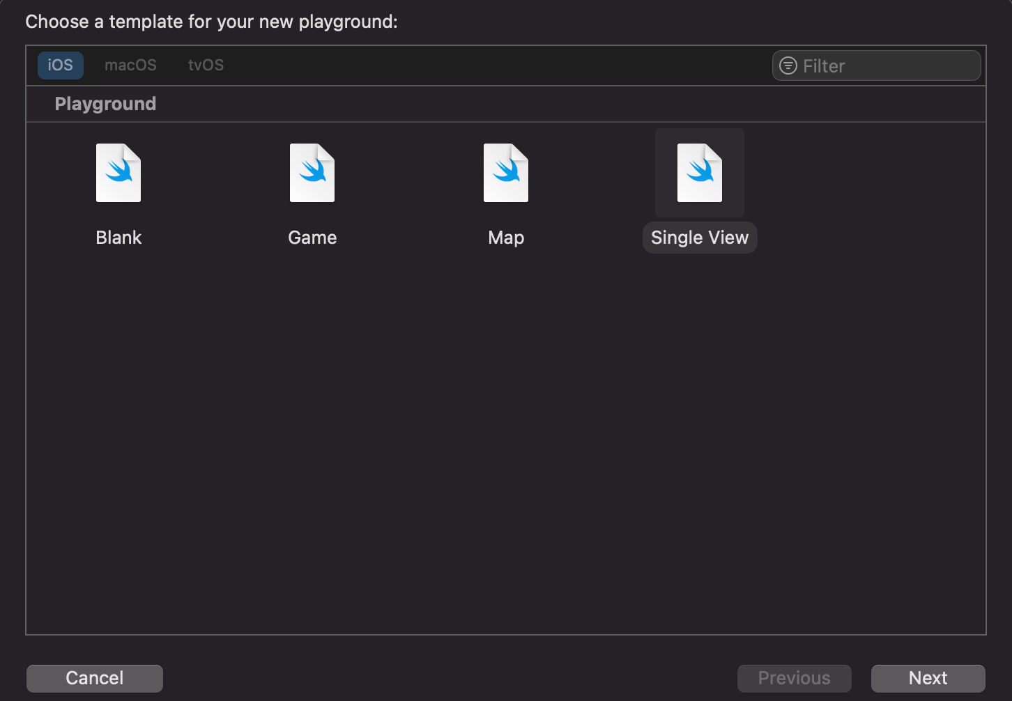 프로토타입 구현을 위해 우선 새로운 플레이그라운들 생성하는 데 Single View를 선택한다.