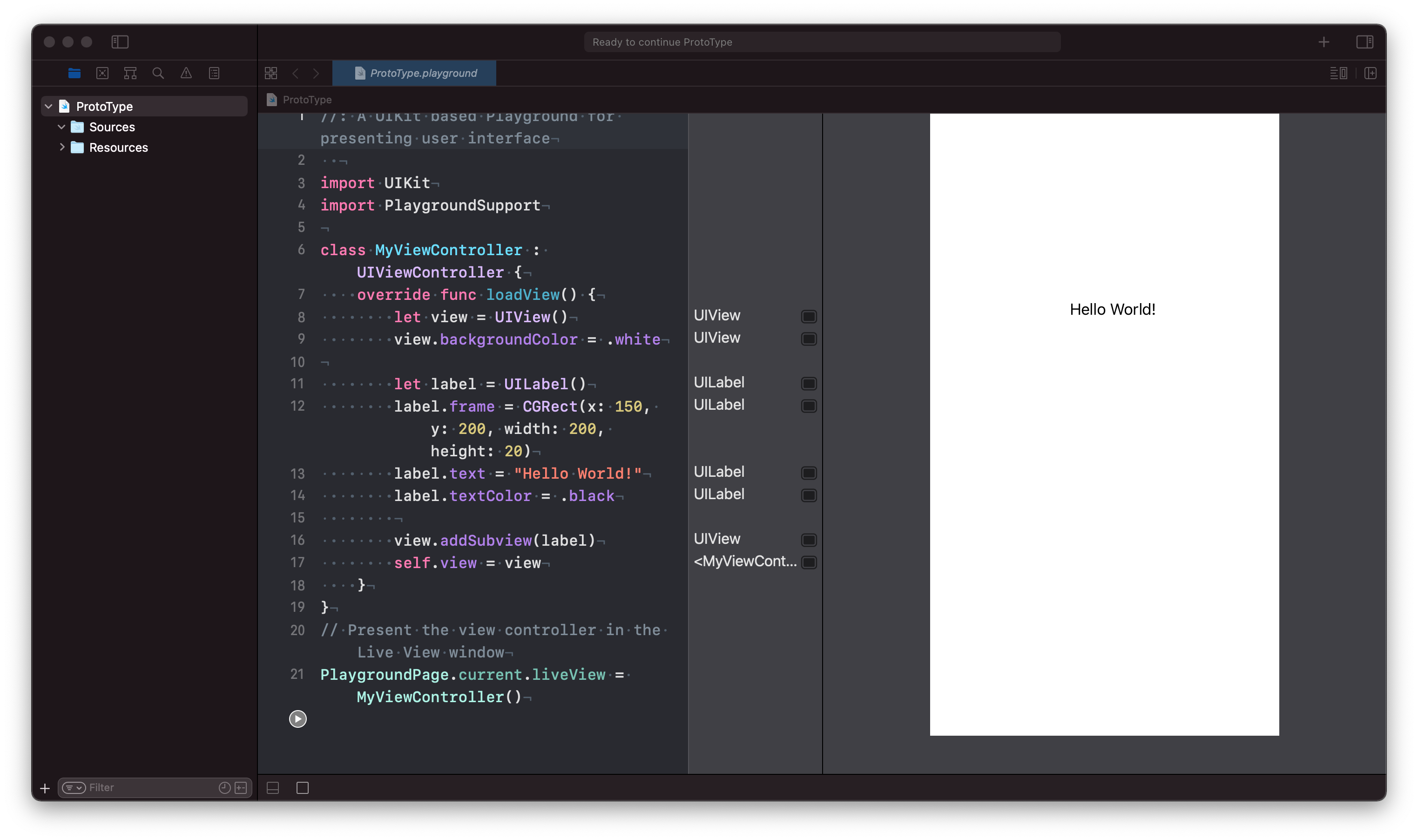 생성된 파일은 UIViewController를 상속받은 MyViewController 클래스가 뷰에 Hello world!를 표시한다.