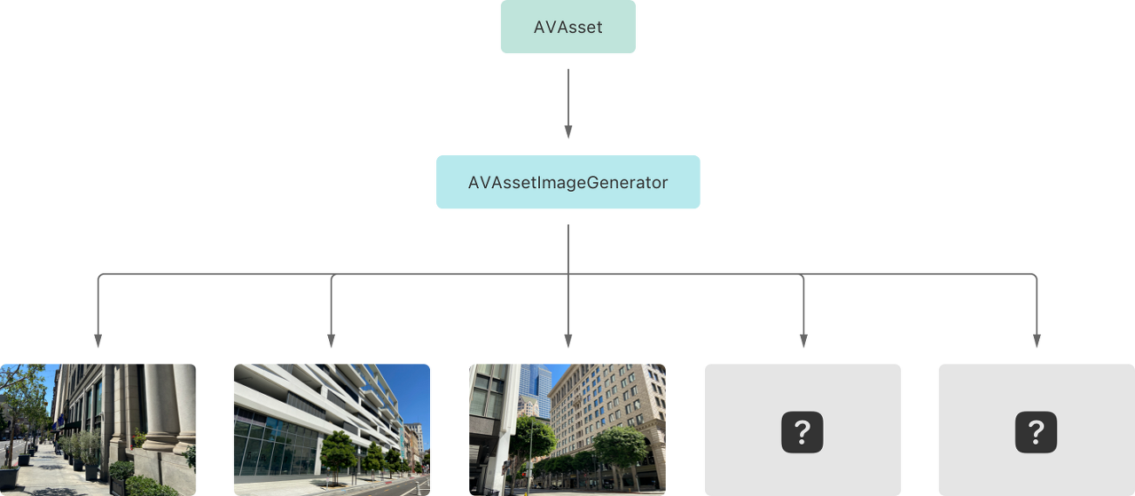 // Generate an image at time zero. Access the image alone. let image = try await generator.image(at: .zero).imagegenerator를 사용하여 비디오 타임라인에서 일련의 이미지를 생성할 수 도 있습니다. 비디오 에셋에서 여러 이미지를 생성하려면 아래와 같이 비동기 함수 images(for:) 함수를 호출합니다.