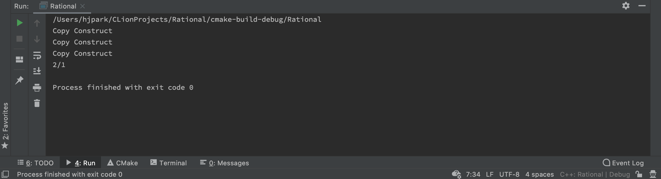 이동 연산자를 추가하지 않은 경우 실행 결과 이제 이동 생성자와 이동 할당 연산자를 Rational 클래스에 추가해 결과가 어떻게 변화는지를 살펴보자..