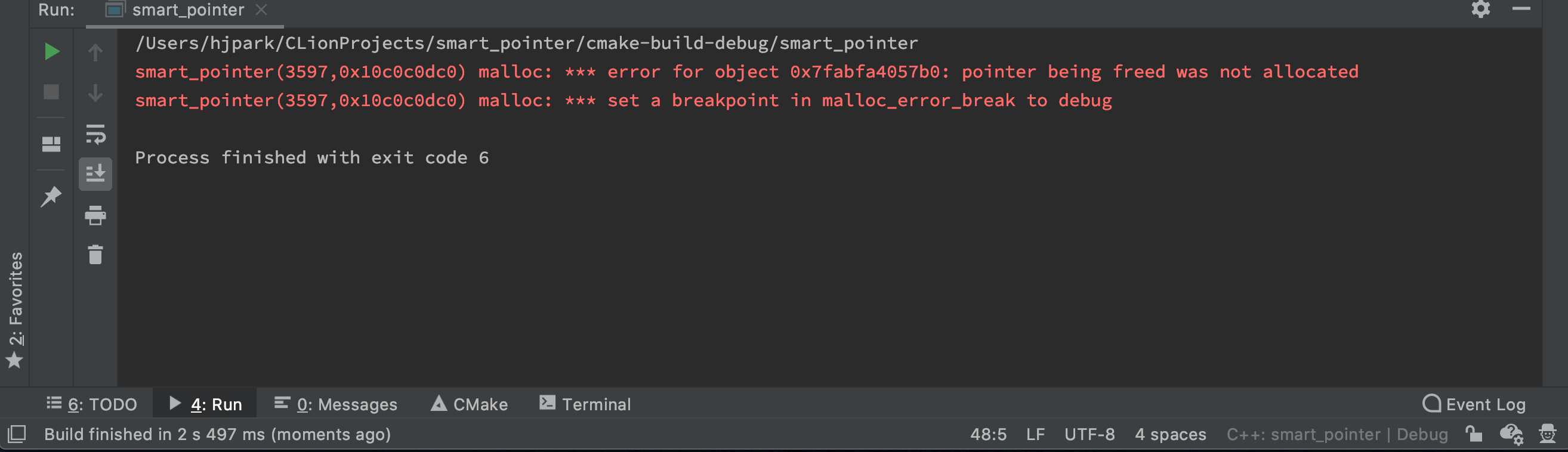 int main() { auto americano = new Americano(); //생 포인터를 사용해 std::unique_ptr을 생성 auto p_americano0 = std::unique_ptr<Americano>(americano); auto p_americano1 = std::unique_ptr<Americano>(americano); //두 unique_ptr 이 동일한 객체를 가리키고 있으므로 해당 객체 소멸이 americano를 두 번 메모리 해제로 에러 발생 //std::unique_ptr 생성자에 생 포인터를 넘기는 일은 피해야함. return 0; }위와 같이 동일한 객체를 가리키는 포인터를 두 std::unique_ptr<Americano> 객체에 넘기는 경우 두 객체가 소멸 시 메모리 해제가 두 번 발생해 예외를 발생한다.